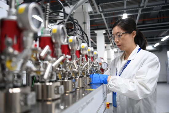 工作人員高巧利在陜西省榆林中科潔凈能源創(chuàng)新研究院工藝放大平臺(tái)實(shí)驗(yàn)室制備催化劑小試樣品(2024年2月28日攝)。新華社記者 鄒競(jìng)一 攝