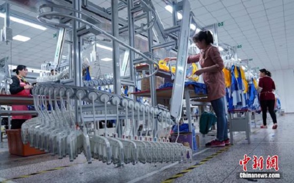 資料圖:圖為工人在勉縣一家制衣廠生產(chǎn)線工作。 毛建軍 攝
