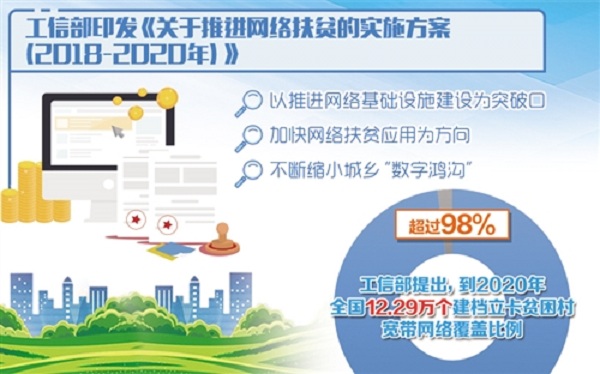 工業(yè)和信息化部網(wǎng)站6月6日顯示,工信部近日印發(fā)《關(guān)于推進(jìn)網(wǎng)絡(luò)扶貧的實施方案(2018—2020年)》,要求以推進(jìn)網(wǎng)絡(luò)基礎(chǔ)設(shè)施建設(shè)為突破口,加快網(wǎng)絡(luò)扶貧應(yīng)用為方向,不斷縮小城鄉(xiāng)“數(shù)字鴻溝”?!斗桨浮诽岢觯?018年,國家“十三五”規(guī)劃綱要明確提出的“寬帶網(wǎng)絡(luò)覆蓋90%以上的貧困村”目標(biāo)提前完成;到2020年,全國12.29萬個建檔立卡貧困村寬帶網(wǎng)絡(luò)覆蓋比例超過98%。