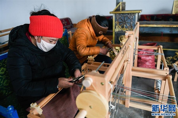 西藏那曲香茂鄉(xiāng)貧困婦女在合作社內(nèi)編織制作民族手工藝品(1月11日攝)。新華社記者 劉東君 攝