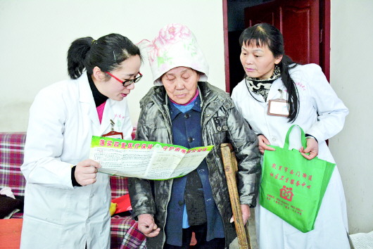 田維菊、文玥給趙勝英講解醫(yī)療政策和健康知識。