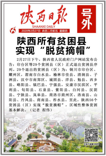 2月27日,陜西省人民政府門戶網(wǎng)站發(fā)布公告:經(jīng)省政府批復(fù)同意,印臺(tái)區(qū)等29個(gè)貧困縣(區(qū))正式退出貧困縣序列。這是繼2017年延長(zhǎng)縣等4個(gè)縣(區(qū))和2018年周至縣等23個(gè)縣退出之后,陜西脫貧攻堅(jiān)取得的又一次決定性勝利。至此,陜西56個(gè)貧困縣(區(qū))實(shí)現(xiàn)“脫貧摘帽”,區(qū)域性整體貧困基本解決。
