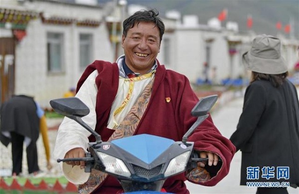 村民永央騎電動車出行(8月2日攝)。近年來,西藏自治區(qū)多措并舉,實施易地扶貧搬遷,解決“一方水土養(yǎng)不起一方人”的發(fā)展困境,使搬遷戶實現(xiàn)穩(wěn)定脫貧、安置區(qū)加快發(fā)展,為鄉(xiāng)村振興奠定了堅實基礎。西藏拉薩市當雄縣羊八井鎮(zhèn)彩渠塘村的150戶683名村民是2017年底開始陸續(xù)從那曲、阿里、昌都等地區(qū)極為艱苦的地帶搬遷而來的。村民原來大多在高寒地區(qū)隨牧而居、沒水沒電、缺醫(yī)少藥。來到新村后,不僅衣食住行和醫(yī)療都有了保障,還靠羊八井地熱溫泉旅游入股分紅,發(fā)展綿羊育肥、手工加工合作社等集體經(jīng)濟和就近就便務工增加收入,村民們過上了幸福的小康生活。