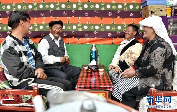 彩渠塘村婦女主任宜西措姆(左一)與村致富帶頭人贊瓊(右一)一家交流(8月2日攝)。近年來,西藏自治區(qū)多措并舉,實施易地扶貧搬遷,解決“一方水土養(yǎng)不起一方人”的發(fā)展困境,使搬遷戶實現(xiàn)穩(wěn)定脫貧、安置區(qū)加快發(fā)展,為鄉(xiāng)村振興奠定了堅實基礎。西藏拉薩市當雄縣羊八井鎮(zhèn)彩渠塘村的150戶683名村民是2017年底開始陸續(xù)從那曲、阿里、昌都等地區(qū)極為艱苦的地帶搬遷而來的。村民原來大多在高寒地區(qū)隨牧而居、沒水沒電、缺醫(yī)少藥。來到新村后,不僅衣食住行和醫(yī)療都有了保障,還靠羊八井地熱溫泉旅游入股分紅,發(fā)展綿羊育肥、手工加工合作社等集體經(jīng)濟和就近就便務工增加收入,村民們過上了幸福的小康生活。新華社記者 張汝鋒 攝