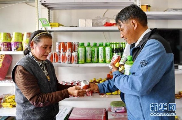 從那曲申扎縣搬遷到彩渠塘村的村民旺扎(右)和妻子塔吉在往自家小賣部的貨架上擺放飲品(8月2日攝)。近年來,西藏自治區(qū)多措并舉,實施易地扶貧搬遷,解決“一方水土養(yǎng)不起一方人”的發(fā)展困境,使搬遷戶實現(xiàn)穩(wěn)定脫貧、安置區(qū)加快發(fā)展,為鄉(xiāng)村振興奠定了堅實基礎。西藏拉薩市當雄縣羊八井鎮(zhèn)彩渠塘村的150戶683名村民是2017年底開始陸續(xù)從那曲、阿里、昌都等地區(qū)極為艱苦的地帶搬遷而來的。村民原來大多在高寒地區(qū)隨牧而居、沒水沒電、缺醫(yī)少藥。來到新村后,不僅衣食住行和醫(yī)療都有了保障,還靠羊八井地熱溫泉旅游入股分紅,發(fā)展綿羊育肥、手工加工合作社等集體經(jīng)濟和就近就便務工增加收入,村民們過上了幸福的小康生活。新華社記者 張汝鋒 攝
