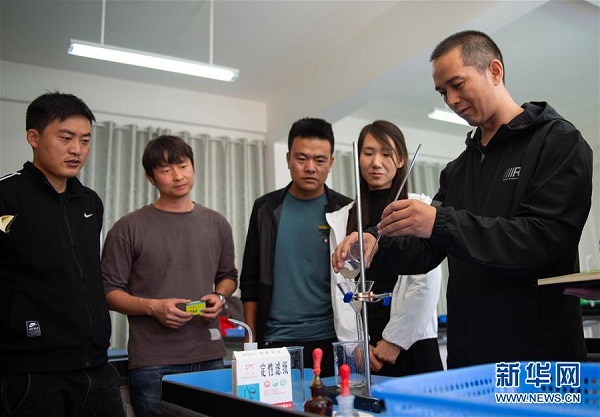 北京市援青支教教師、來自通州區(qū)陸辛莊學(xué)校的化學(xué)教師祁生貴(右一)在青海省玉樹州第四民族高級(jí)中學(xué)指導(dǎo)學(xué)校教師進(jìn)行實(shí)驗(yàn)教學(xué)(8月12日攝)。新華社記者 陳鐘昊 攝