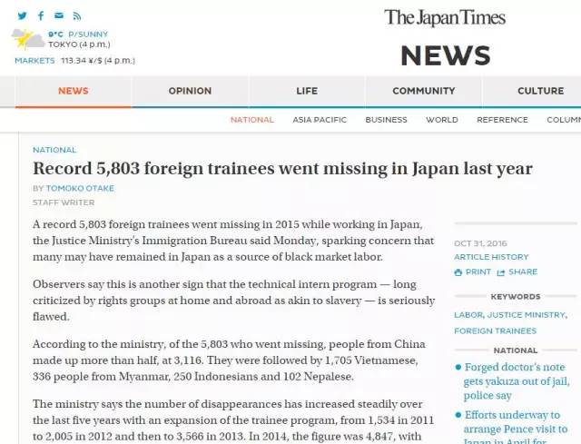 《日本時(shí)報(bào)》2016年的一篇報(bào)道稱,2015年,共有5803名在日研修生失蹤,其中來自中國的為3116人,占到一大半。過去5年,這個(gè)數(shù)字一直在不斷增加。