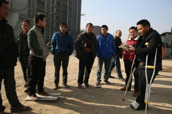 河北定州勝利街建華社區(qū)的一個工棚內,重慶涪陵籍農民工趙家友拄著拐杖目光沉重地望著窗外被霧霾籠罩的天空。因為合伙承包的定州市東明家具城商業(yè)樓項目885.9萬元工程款被拖欠,去年10月22日他帶工人討要工程尾款時遭追打,趙家友的腿被開發(fā)商定州市豐源房地產開發(fā)有限公司(以下簡稱:豐源房地產公司)工作人員打骨折。