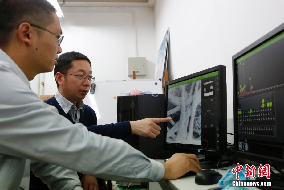 1月3日,北京化工大學(xué)高分子納米復(fù)合材料實(shí)驗(yàn)室劉勇教授通過(guò)臺(tái)式掃描電子顯微鏡,觀察近期使用后的防霾鼻罩濾芯上采集的霧霾顆粒,以及分析霧霾顆粒里面含有的各種元素。近日,北京持續(xù)霧霾天氣。中新社記者 韓海丹 攝