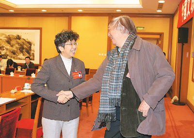 11月28日,王安憶(左)、張煒(右)在開會前交談。