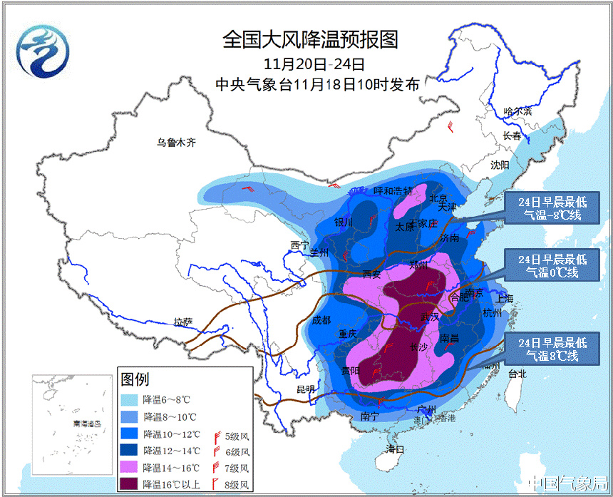 24日凌晨,最低氣溫0℃線可南壓至淮河、漢江到四川北部和川西高原一線;華北平原南部部分地區(qū)最低氣溫將達(dá)到-8℃左右,華北平原局部地區(qū)日最低氣溫接近歷史11月中下旬極值;江南南部和華南北部最低氣溫將達(dá)到4~8℃左右。