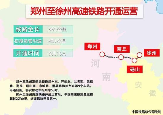隨著9月10日6點(diǎn)31分G1908次高鐵列車從鄭州東站發(fā)出,鄭(州)徐(州)高鐵正式開(kāi)通運(yùn)營(yíng),標(biāo)志著中國(guó)高鐵運(yùn)營(yíng)里程突破2萬(wàn)公里。