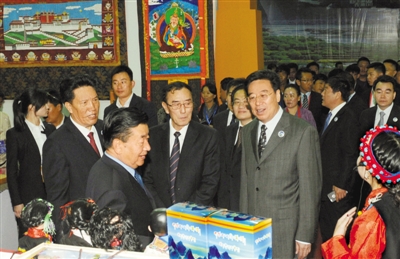 吳英杰、向巴平措、洛桑江村等與中外嘉賓一起步入展館,邊走邊看,認(rèn)真聽取講解。在西藏唐卡藝術(shù)、藏族礦物植物顏料制作、西藏陶器制作技藝等館區(qū),大家不時停下腳步,饒有興致地駐足觀看;“美麗家園幸福拉薩”“藏源雅礱幸福山南”“人間凈地醉美林芝”……七地市展館推出的精品旅游景點和特色旅游產(chǎn)品受到參觀的領(lǐng)導(dǎo)和嘉賓一致好評;在“西藏好水世界共享”展館,“5100”“珠峰冰川”“西藏神水”等區(qū)內(nèi)十幾個品牌的天然飲用水整齊擺放,讓人看到了我區(qū)天然飲用水產(chǎn)業(yè)良好的發(fā)展勢頭和巨大的發(fā)展前景;藏毯、卡墊、佛像、飾品……來自西藏、青海和尼泊爾等地的商品極大豐富了展覽內(nèi)容……