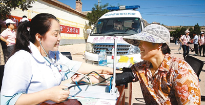 7月28日,在甘肅定西安定區(qū)魯家溝鎮(zhèn),“母親健康快車”的醫(yī)生為群眾義診,隨行的中國(guó)婦女發(fā)展基金會(huì)工作人員為當(dāng)?shù)厝罕姲l(fā)放了嬰幼兒奶粉等愛(ài)心物資。