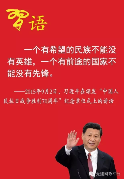 今天,中國正在發(fā)生日新月異的變化,我們比歷史上任何時期都更加接近實現(xiàn)中華民族偉大復(fù)興的目標。實現(xiàn)我們的目標,需要英雄,需要英雄精神。我們要銘記一切為中華民族和中國人民作出貢獻的英雄們,崇尚英雄,捍衛(wèi)英雄,學(xué)習(xí)英雄,關(guān)愛英雄,戮力同心為實現(xiàn)“兩個一百年”奮斗目標、實現(xiàn)中華民族偉大復(fù)興的中國夢而努力奮斗!