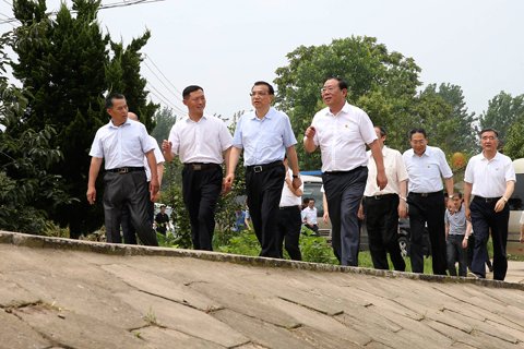 因為此前沒有地下管網(wǎng)規(guī)劃,村內(nèi)原本的路面經(jīng)過幾場暴雨已變成一條積水的“河道”,房屋全都被泡在水里。李克強打著傘在高處觀察后,從一處豁口踩著濕滑泥濘的土坡,走到內(nèi)澇積水區(qū)旁仔細查看。