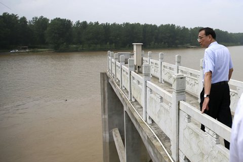 飛機抵達安徽阜陽后,李克強換乘汽車馬不停蹄,于上午10:40趕到被稱為“千里淮河第一閘”的王家壩閘,察看淮河防汛。閘內(nèi)的濛洼蓄洪區(qū)建于1951年,建成后曾15次滯蓄洪水,削減淮河干流洪峰。