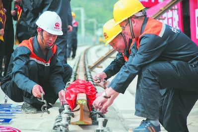 16日,工人對滬昆高鐵全線最后一段軌道進(jìn)行施工。