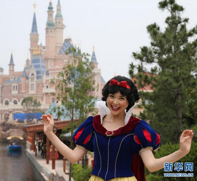 6月15日,“白雪公主”在上海迪士尼樂園內(nèi)迎客。 6月16日,上海迪士尼度假區(qū)將正式開園迎客。 新華社記者 裴鑫攝