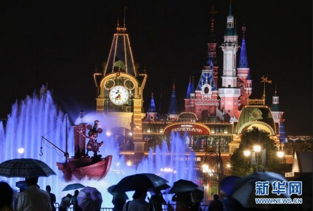 6月15日,游客在觀看花車巡游。 6月16日,上海迪士尼度假區(qū)將正式開園迎客。 新華社記者 丁汀 攝