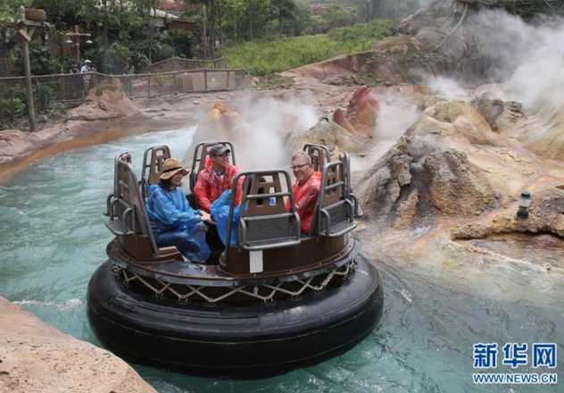 6月15日,受邀參加開幕典禮的游客在上海迪士尼樂園內(nèi)體驗(yàn)“雷鳴山漂流”。 6月16日,上海迪士尼度假區(qū)將正式開園迎客。新華社記者裴鑫 攝