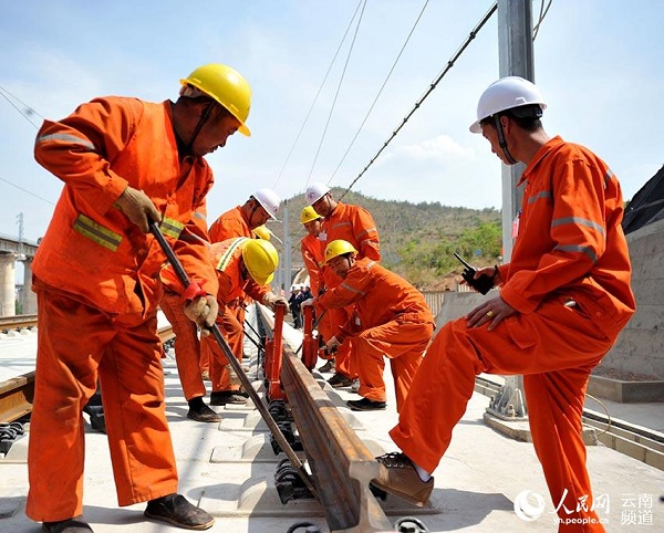 4月28日,施工人員在滬昆高鐵云南段大新冊大橋與黃連山二號隧道接軌點撥接長鋼軌。