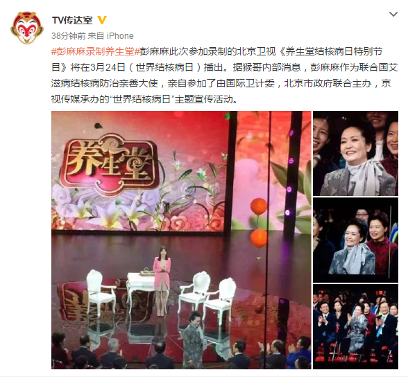 據(jù)微博大號@TV傳達室爆料,這期節(jié)目將于3月24日(世界結(jié)核病日)播出。《養(yǎng)生堂》是北京電視臺科教頻道的一檔節(jié)目,彭麗媛之所以參加節(jié)目錄制,是作為聯(lián)合國艾滋病結(jié)核病防治親善大使。這期節(jié)目也是由國際衛(wèi)計委,北京市政府聯(lián)合主辦,京視傳媒承辦的“世界結(jié)核病日”主題宣傳活動。