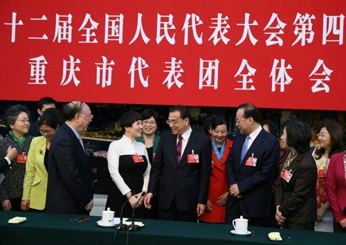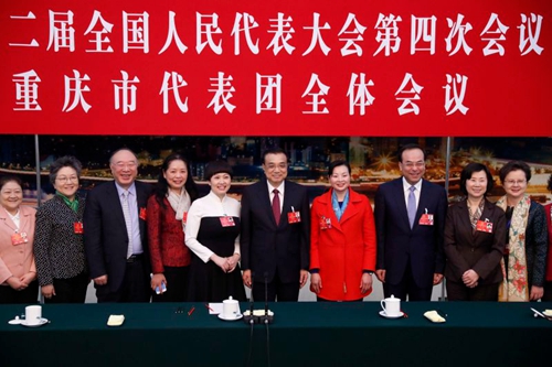 人民網(wǎng)北京3月8日電(記者楊芳)8日上午,李克強在參加十二屆全國人大四次會議重慶代表團全體會議時,現(xiàn)場女代表提議總理會后和女同胞們合影。李克強當(dāng)即答應(yīng),并向在場的所有女代表,以及參加“兩會”的全體女代表委員、工作人員致以三八婦女節(jié)問候。