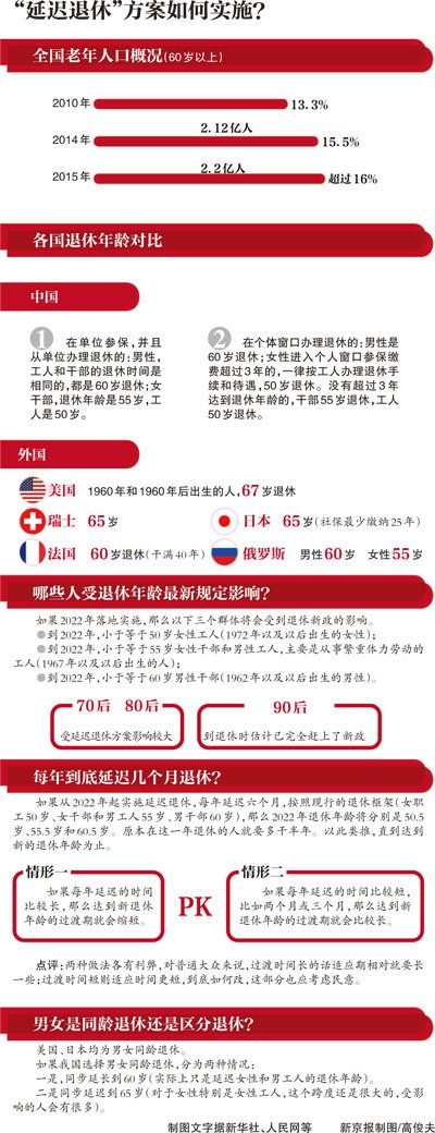 至于征求意見后何時正式出臺實施?人社部社會保障研究所所長金維剛近日表示,延遲退休方案將在明年正式出臺,出臺后會有五年左右的過渡期,或到2022年正式實施。