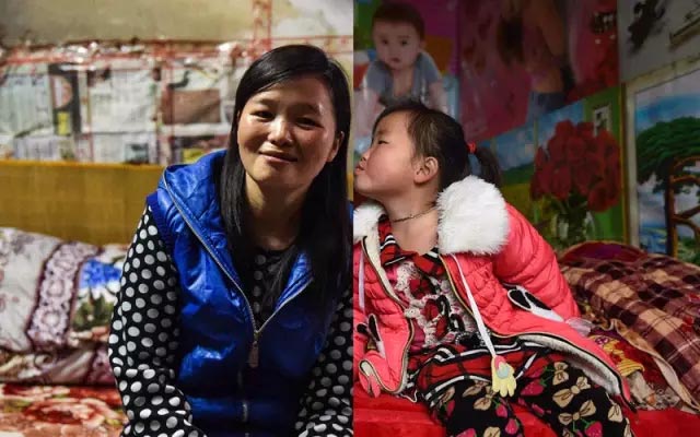 2月22日,在廣東東莞市鳳崗鎮(zhèn)官井頭村的出租屋內(nèi),蒙愛(ài)林(左圖 新華社記者毛思倩 攝)坐在床邊,感受小女兒遠(yuǎn)在廣西老家千里之外的親吻(右圖 新華社記者黃孝邦 攝)。