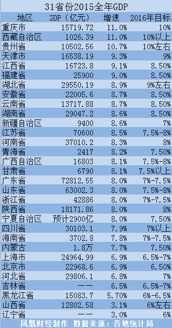 鳳凰財(cái)經(jīng)訊 隨著各地兩會(huì)的召開,各省市2015年GDP總量、增速及2016年GDP增長(zhǎng)目標(biāo)陸續(xù)公布。鳳凰財(cái)經(jīng)梳理發(fā)現(xiàn),全國(guó)31省市有26省市GDP增速超過全國(guó)增速,25省市GDP總量邁入“萬億俱樂部”。