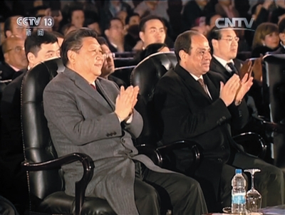 晚上8時(shí)30分許,習(xí)近平和塞西共同步入開幕式現(xiàn)場。埃及文化部部長希勒米和中國文化部部長雒樹剛先后致辭,共同宣布2016中埃文化年啟動(dòng)。習(xí)近平和塞西同中埃各界人士200多人共同觀看了由中埃演職人員聯(lián)袂獻(xiàn)上的《兩個(gè)偉大文明對(duì)話》主題演出。