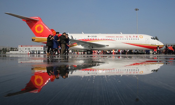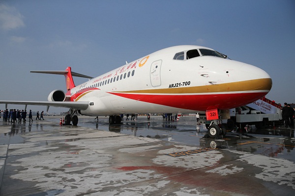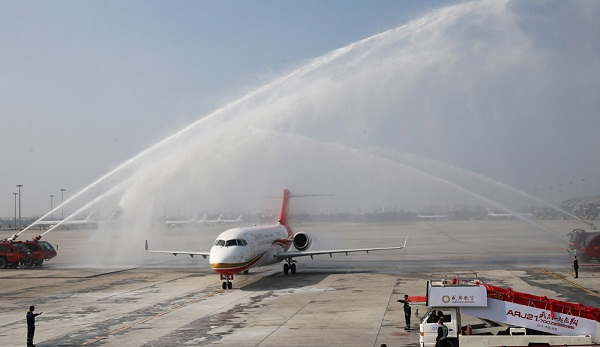 11月29日,以中國商飛公司為主制造商的我國ARJ21新支線飛機從上海飛往成都,正式交付給成都航空公司。這是繼11月2日C919大型客機總裝下線后,我國航空工業(yè)又一重大突破,標(biāo)志著我國走完了噴氣式支線客機設(shè)計、試制、試驗、試飛、取證、生產(chǎn)、交付全過程,具備了噴氣式支線客機的研制能力和適航審定能力。國內(nèi)航線首次擁有自己的噴氣式支線客機。新華社 記者 裴鑫 攝