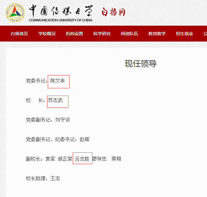 中國傳媒大學現(xiàn)任領導班子,紅框為被處分領導