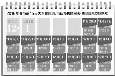 鐵路部門表示,鐵路春運時段以每年春節(jié)為界,節(jié)前15天,節(jié)后25天,整個春運為期40天。2016年春節(jié)為2月8日,以此推算,2016年春運將于1月24日啟動,并于3月3日結束。