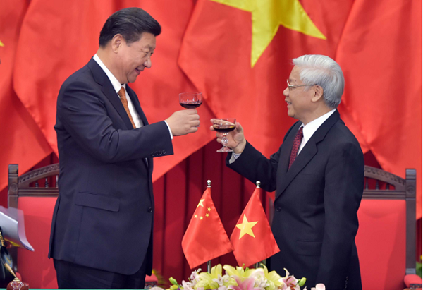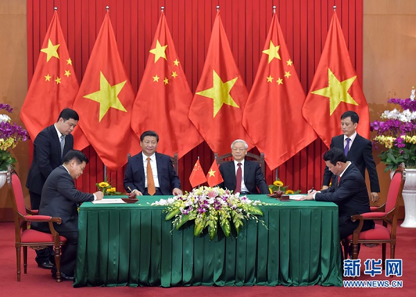 11月5日,中共中央總書記、國家主席習(xí)近平在河內(nèi)同越共中央總書記阮富仲舉行會談。這是會談后,兩國領(lǐng)導(dǎo)人共同見證雙邊合作文件的簽署。新華社記者李濤攝