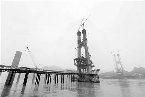8月10日,渝黔鐵路新線新白沙沱長江大橋首對斜拉索掛設成功,全面進入橋梁施工階段。圖為施工現場。記者羅斌攝