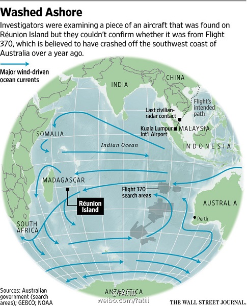 目前MH370的搜索區(qū)域圖與發(fā)現(xiàn)襟副翼的留尼汪地理位置及洋流流向圖,圖中黑色方框指向處為留尼汪島。來自華爾街日報