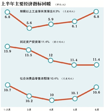 “二季度最顯著的特點,就是主要指標增速在回暖?!笔磉\說。從實體經(jīng)濟角度,規(guī)模以上工業(yè)增加值增速實現(xiàn)連續(xù)3個月回升。今年上半年,改革紅利在繼續(xù)釋放,這一點主要表現(xiàn)在民營經(jīng)濟活力有所增強,在一系列簡政放權措施推動下,上半年,民間投資也達154438億元,增長11.4%。