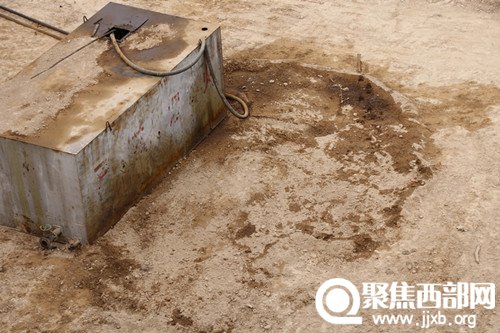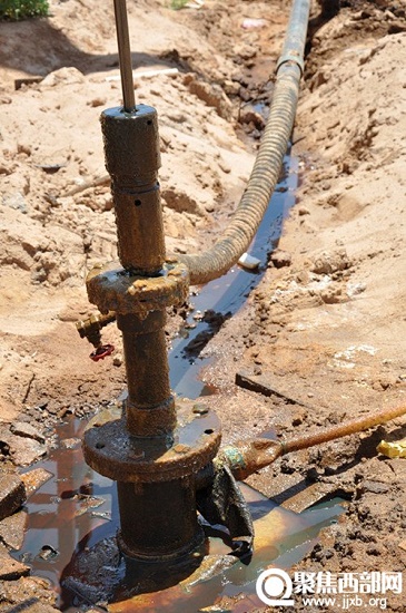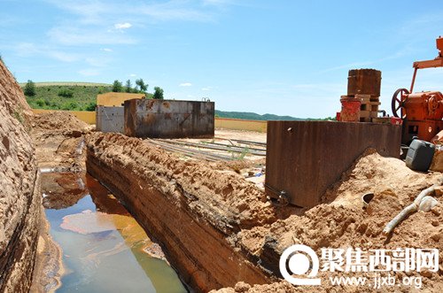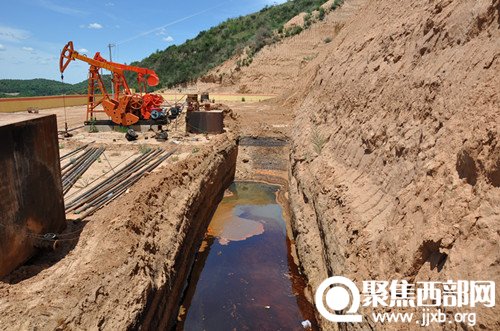 6月13日,筆者來到富縣北道德鄉(xiāng)渭家河萬紫村直羅采油大隊紫25—3井場,看到約40多平方米的污油池未采取任何防滲漏措施,池內(nèi)大部分原油已滲入土壤,剩下的原油在烈日的暴曬下散發(fā)出刺鼻的氣味,池邊一長方體儲油罐的閥門正向坑內(nèi)滴著污油;在嶄新的抽油機下方,四溢的原油在地下聚成一條小河。