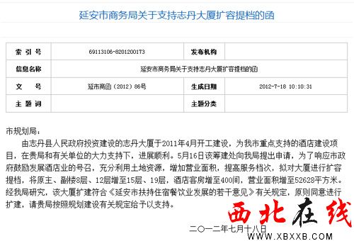 據(jù)“延市商函〔2012〕86號”文件中向延安市城鄉(xiāng)規(guī)劃局?jǐn)U容提檔函中明確指出,為了響應(yīng)市政府鼓勵發(fā)展酒店業(yè)的號召,充分利用土地資源,增加營業(yè)面積,提高服務(wù)檔次,擬對大廈進(jìn)行擴(kuò)容提檔,將志丹大廈原主、副樓8層、12層分別增至15層、19層,酒店客房增至400間,營業(yè)面積增至52628平方米。經(jīng)市商務(wù)局研究,該大廈擴(kuò)建符合《延安市扶持住宿餐飲業(yè)發(fā)展的若干意見》有關(guān)規(guī)定,原則同意進(jìn)行擴(kuò)建的文件,而延安市城鄉(xiāng)規(guī)劃局給予該樓頒發(fā)的建設(shè)用地規(guī)劃許可證中也明確寫道,用地性質(zhì)為酒店,這些文件明確指出住戶們居住的樓房應(yīng)當(dāng)為酒店式公寓房。