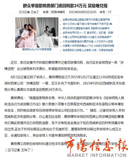 日前,有媒體報道稱“陜西寧陜縣黃某因舉報一企業(yè)逃稅助稅務(wù)局追回24萬稅款,獎勵難兌現(xiàn)”。市場信息報記者走訪了解到,黃某舉報一企業(yè)逃稅助西咸新區(qū)國家稅務(wù)局灃東分局追回24萬稅款一事屬實。國稅灃東分局回應(yīng),舉報人按程序遞交書面獎勵申請后,經(jīng)上級部門審核批準(zhǔn),將在一周內(nèi)按國家相關(guān)政策發(fā)放獎金,不存在獎勵難兌現(xiàn)的問題。
