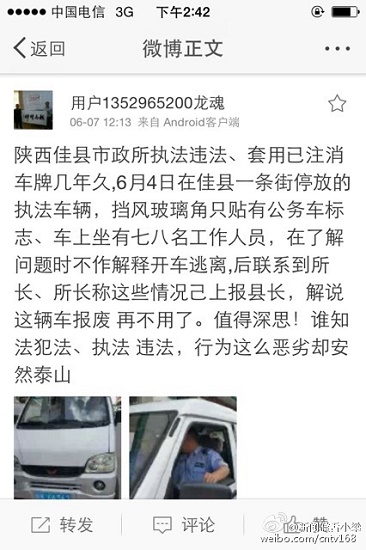 陜西佳縣市政所執(zhí)法違法、套用已注消車牌幾年之久,6月4日在佳縣一條街停放的執(zhí)法車輛,擋風(fēng)玻璃角只貼有公務(wù)車標(biāo)志、車上坐有七八名工作人員,在了解問題時不作解釋開車逃離,后聯(lián)系到所長、所長稱這些情況己上報縣長,解說這輛車報廢再不用了。值得深思!誰知法犯法、執(zhí)法違法,行為這么惡劣卻安然泰山。