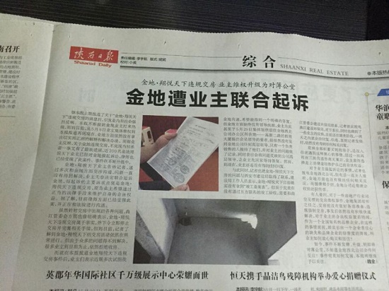 繼陜西日?qǐng)?bào)上期報(bào)道了關(guān)于“金地·翔悅天下”違規(guī)交房的消息后,引發(fā)業(yè)內(nèi)和社會(huì)強(qiáng)烈反響。本報(bào)不斷接到金地業(yè)主打來熱線,而到目前,從5月9日業(yè)主集體維權(quán)到本報(bào)報(bào)道再到現(xiàn)在,金地方面依然沒有拿出切實(shí)而正面的解釋和解決辦法。而據(jù)業(yè)主反映,關(guān)于金地違規(guī)交房,不兌現(xiàn)當(dāng)初承諾一事又有了最新進(jìn)展,近200名金地翔悅天下業(yè)主已經(jīng)對(duì)金地提起訴訟,律師也已經(jīng)受理了此案件。事件在不斷升級(jí)中。