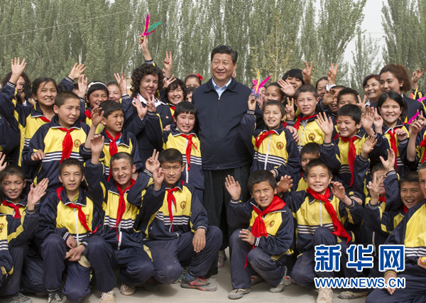 2014年4月27日至30日,中共中央總書記、國(guó)家主席、中央軍委主席習(xí)近平在新疆考察。這是習(xí)近平在疏附縣托克扎克鎮(zhèn)中心小學(xué)同學(xué)生們合影。新華社 記者謝環(huán)馳 攝
