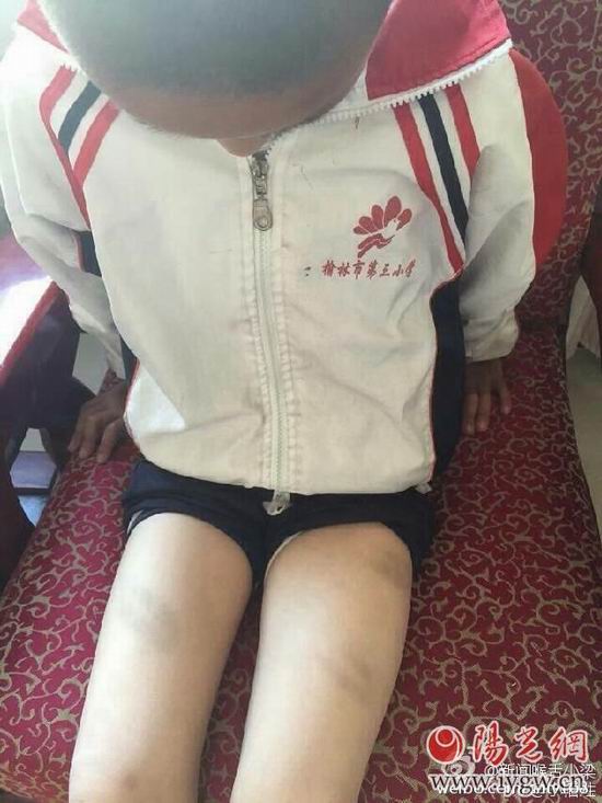 微博內(nèi)容反映稱:榆林市第三小學(xué)三年級四班班主任于2015年5月13日早上用棍子當(dāng)全班58人面毆打?qū)W生(有照片為證),只因孩子期中考試成績低,共毆打班內(nèi)多名小孩!從圖片中可以看出一學(xué)生穿著榆林市第三小學(xué)校服,褲子挽至大腿,被毆打部位淤青痕跡很明顯。