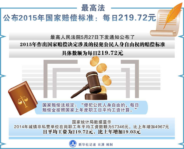 新華網(wǎng)北京5月27日電 記者從最高人民法院獲悉,最高法27日下發(fā)通知,公布了2015年作出國(guó)家賠償決定涉及的侵犯公民人身自由權(quán)的賠償標(biāo)準(zhǔn),具體數(shù)額為每日219.72元。