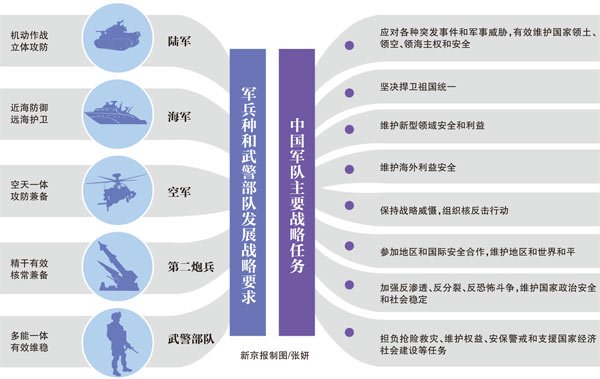 白皮書指出,陸軍的發(fā)展戰(zhàn)略要求為機(jī)動(dòng)作戰(zhàn)、立體攻防,海軍為近海防御、遠(yuǎn)海護(hù)衛(wèi),空軍為空天一體、攻防兼?zhèn)洌诙诒鵀榫捎行?、核常兼?zhèn)?,武警部?duì)為多能一體、有效維穩(wěn)。