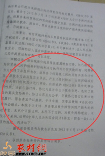 據(jù)張美秀講,因余良友不分晝夜的到家中吵鬧,自己于2012年8月期間離開自己家中,此后余良友鳩占鵲巢,將已經(jīng)抵償給他人的房屋據(jù)為己有。此后,她向鎮(zhèn)政府要求撤銷其不公平協(xié)議,而鎮(zhèn)政府執(zhí)意不予撤銷。為此,張美秀將余良友告到石泉縣法院,法院不予受理之后,張美秀又向安康市中級(jí)人民法院提起訴訟,安康市中級(jí)人民法院指定寧陜縣人民法院審理此案。寧陜縣人民法院以2012寧民初字第00199號(hào)民事判決書進(jìn)行了判決,一、撤銷原告張美秀與余良友2012年5月17日簽訂的協(xié)議書;二,駁回原告張美秀的其他訟訴請(qǐng)求。此后,雙方就撤銷協(xié)議書多次訴諸法律,而且,此后的判決均支持了余良友的訴求。