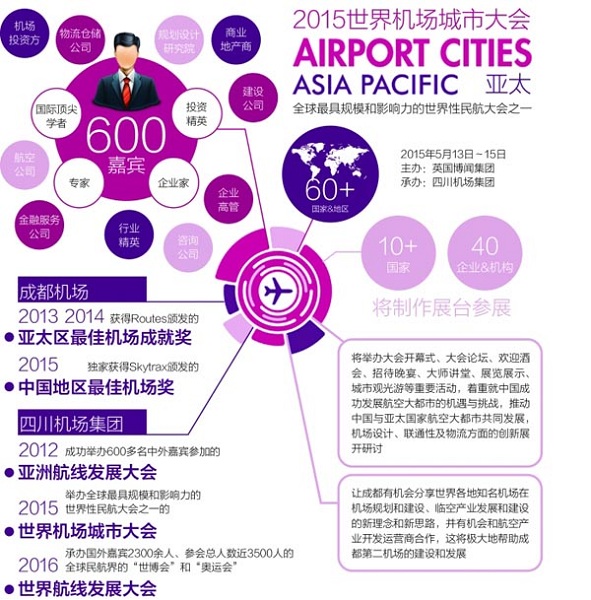 本屆大會由英國博聞集團主辦、四川機場集團承辦,是全球最具規(guī)模和影響力的世界性民航大會之一。該大會與世界航線發(fā)展大會一同被譽為國際民航界的“雙子星”,2016年世界航線發(fā)展大會也將在成都舉行。成都機場也將成為繼首都機場后,國內第二座同時舉辦兩大會議的機場,為成都機場打造世界十佳機場的目標增添重要砝碼。